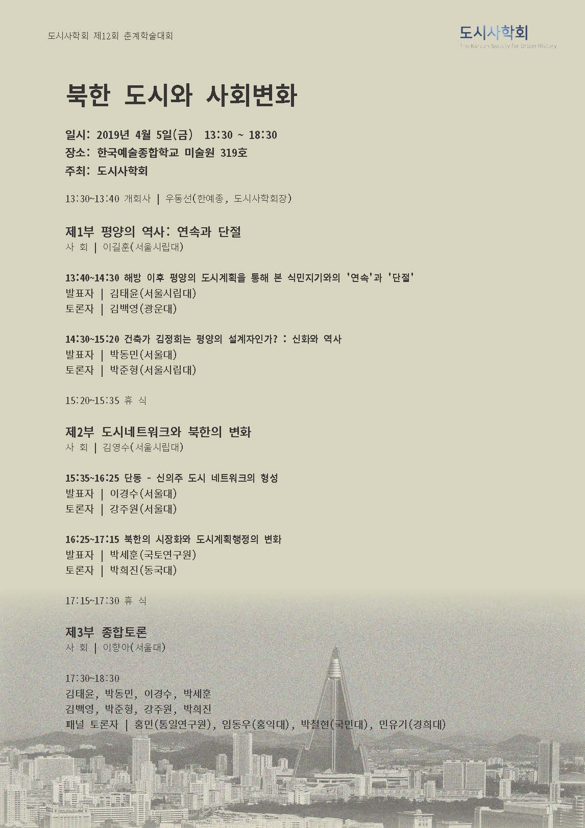 이번에 2019년 4월 5일 도시사학회 춘계학술대회가 있어 안내드립니다.