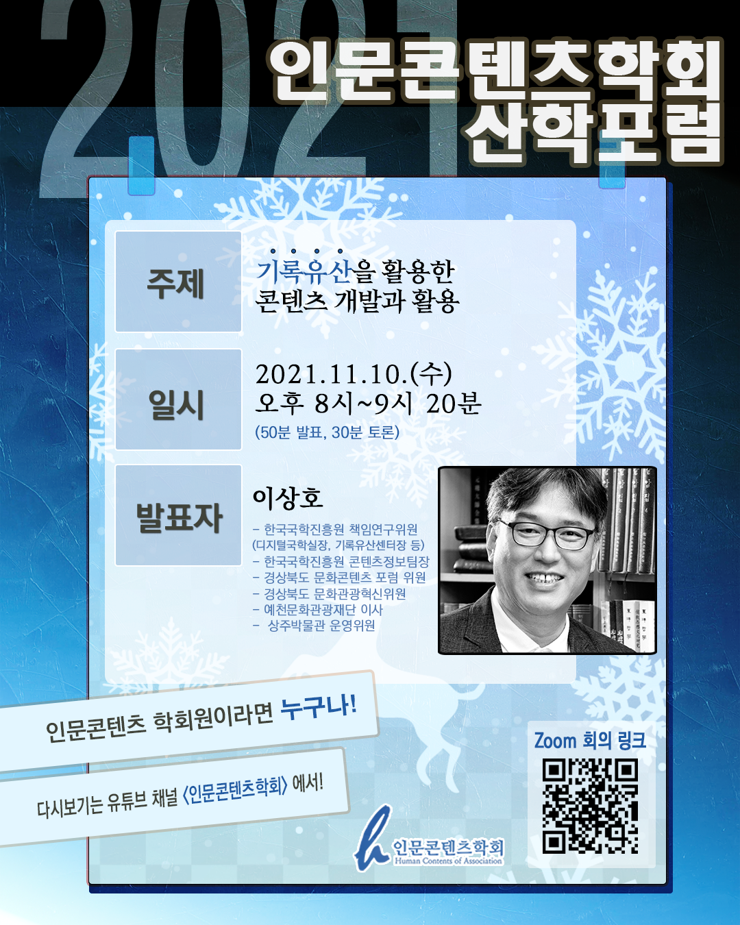 11월 10일 수요일 20시에 진행하는 2021 인문콘텐츠학회 산학 포럼 안내공지 입니다.